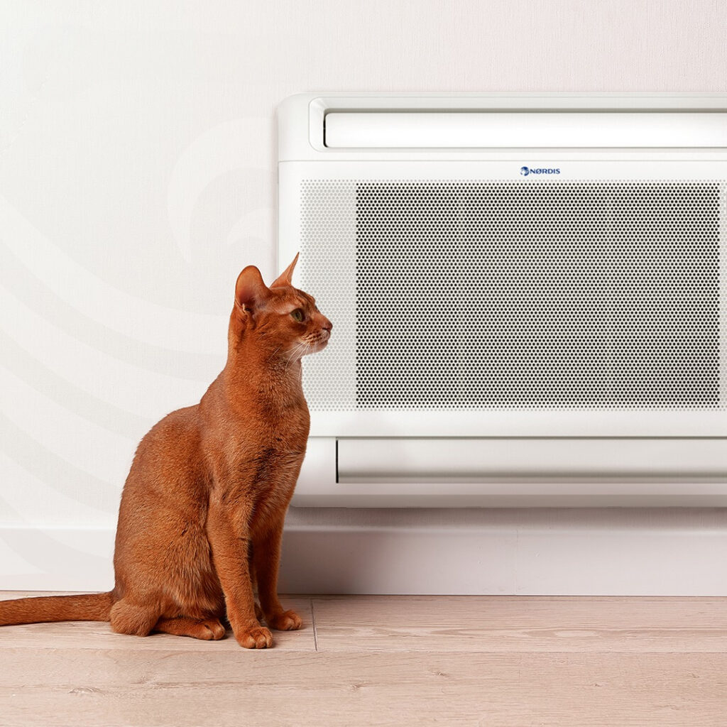 Klimatyzatory konsolowe NØRDIS – pompy ciepła powietrze–powietrze wspierają utrzymanie wysokiej jakości powietrza w pomieszczeniu. Zintegrowany inteligentny system kontroli wilgotności w połączeniu z generatorem jonów neutralizuje mikroorganizmy unoszące się w powietrzu i pomaga utrzymać świeże oraz czyste powietrze.